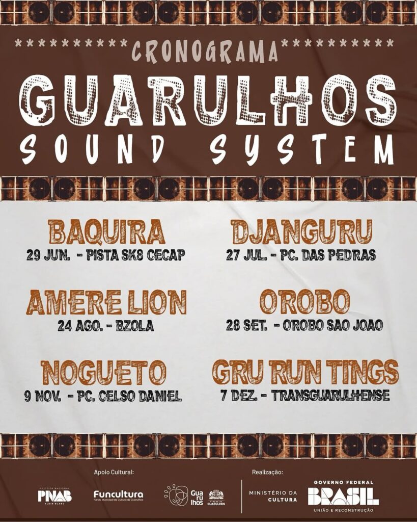 A cultura sound system tem dado passos cada vez mais firmes em direção ao reconhecimento institucional, sem perder suas raízes na rua. Um dos mais recentes exemplos disso está vindo de Guarulhos (SP), onde cinco equipes locais se uniram para realizar o Guarulhos Sound System, projeto contemplado pela Lei Aldir Blanc via PNAB (Política Nacional Aldir Blanc de Fomento à Cultura). A proposta vai promover seis bailes públicos gratuitos em diferentes territórios da cidade, de junho a dezembro de 2025, destacando a força da coletividade e a ocupação simbólica de praças que já são referência na cena.